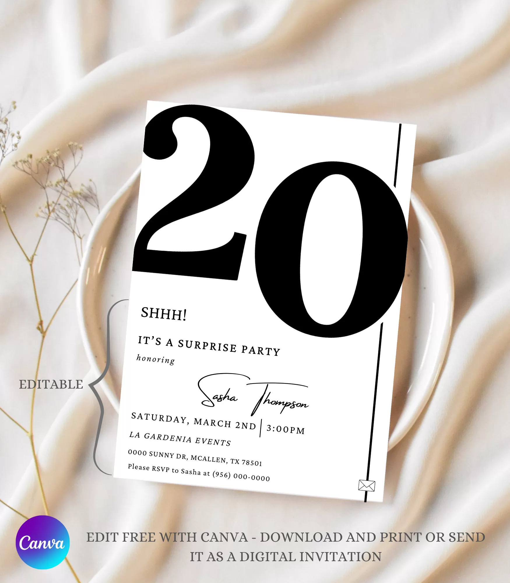20th Birthday Party • Invitation Canva Template • Lifetime Access