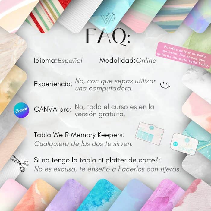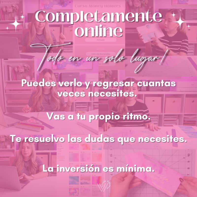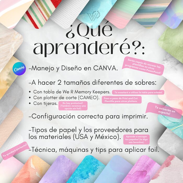 -5 Videos de curso (Materiales, Diseño de 4 sobres diferentes en CANVA, instrucciones para utilizar Tabla de We r Memory Keepers, paso a paso con plotter de corte CAMEO y manualmente con tijeras, impresión correcta, mis impresoras y como buscar las tuyas, aplicación y tips para foil, etc.).